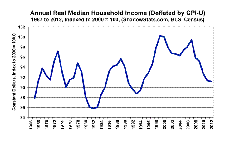 Real Median Household Income Is at Its Lowest Level Since 1994. Real (inflation-adjusted) median household income contracted again in 2012, although the annual change was not statistically significant. Nonetheless, the level was the lowest seen since 1994, and was lower than levels indicated for the 1968 to 1974 period, using the CPI-U as a deflator. As indicated by the Sentier Research numbers, and confirmed broadly by the Census data, consumer income contracted into the formal 2007 recession, with the decline in income accelerating into the period of the purported post-June 2009 economic recovery. With the Sentier numbers now stagnant at a low level of activity, and consumers’ inability to expand borrowing in order to make up for shortfalls in income, the chances of there having been a full economic recovery since 2009 (as reflected in the GDP), or of a recovery pending in the immediate future, remain nil.
