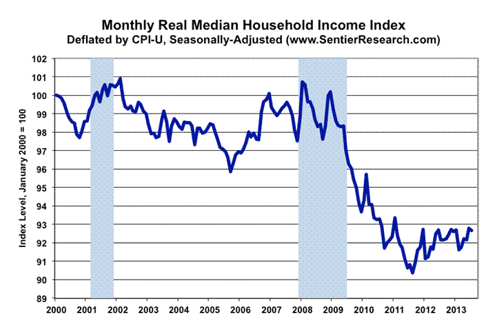 The first graph, preceding is the Census series of annual real median income, as deflated by the CPI-U and indexed to 2000 = 100. The second graph is based on Sentier’s monthly data on real median household income, as deflated by the CPI-U and indexed to January 2000 = 100. Where the index overlapping is not exact, the annual patterns seen in the Census data are broadly consistent with the Sentier data for the period 2000 to 2012. The Sentier numbers continue through July 2013 reporting.