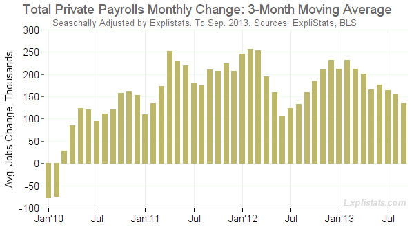 The U.S. Economy Continues to Weaken. The first major economic reporting since the reopening of the federal government has confirmed a deteriorating outlook for U.S. business activity. As shown in the accompanying graph of private payrolls, the pre-government-shutdown employment trends through September were downright negative. On a three-month, moving-average basis, payrolls have been slowing since the beginning of 2013, through September. Private payrolls are shown here, in that they were not distorted by 2010 Census hiring and firing. Although these payrolls will not be hit directly by the October government furloughs, they certainly will reflect secondary impact.