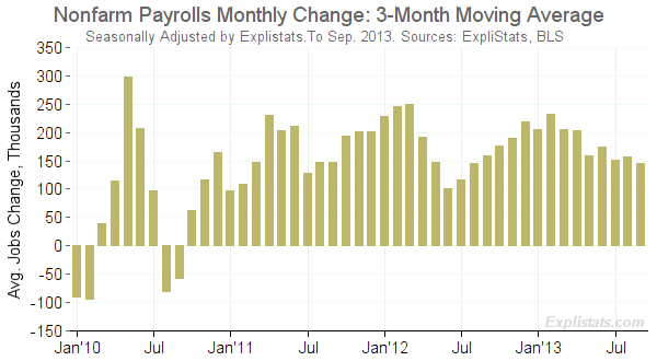 Trend Model. As described generally in Payroll Trends, the trend indication from the BLS’s concurrent seasonal-adjustment model is for a 67,000 monthly payroll gain in October 2013, based on September’s reporting. This excludes any anticipated impact from the recent shutdown in some federal government activity.