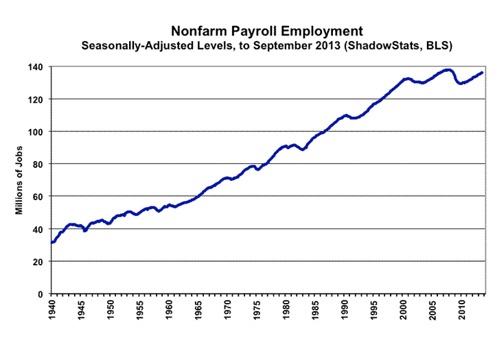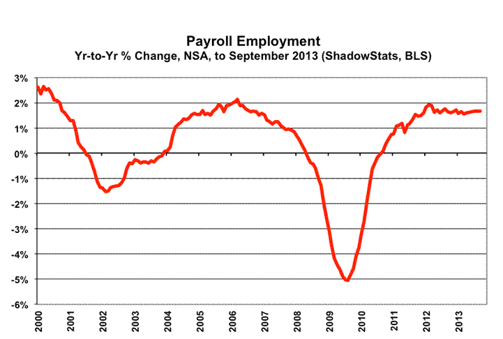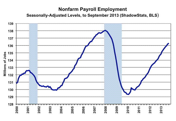 2013 Benchmark Revision. As discussed in Commentary No. 526, of September 26th, the announced benchmark revision to the 2013 payroll survey would be tantamount to fraud, if the entire historical series is not otherwise revamped for a major redefinition of nonfarm payrolls. As standardly reported, the March 2013 benchmarking lowered the payroll levels of that time by 124,000 jobs, instead of the 345,000 “increase” reported, which included 469,000 new workers who were classified and defined previously as not counted in nonfarm payrolls.
