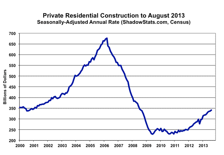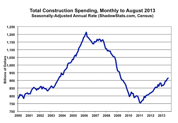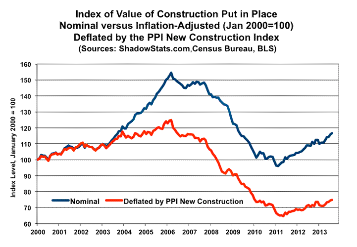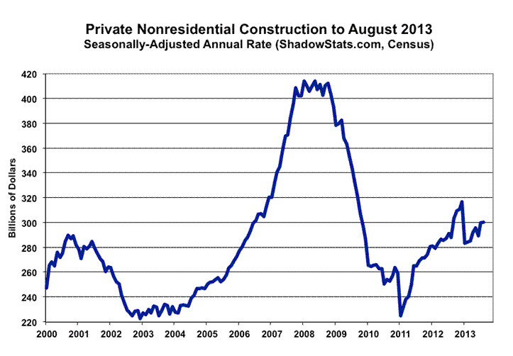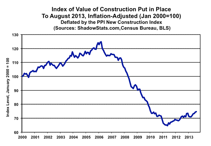The preceding two graphs reflect total construction spending through August 2013, the first is before inflation adjustment; the second is an aggregate index reflecting inflation-adjusted data. The second graph (see also Opening Comments) shows the August 2013 ShadowStats estimation of an inflation-adjusted construction spending series. Suggestive of the August monthly gain largely reflecting higher costs, instead of increased physical construction volume.