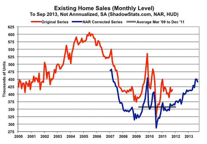 September 2013 Existing-Home Sales Reporting. Yesterday’s (October 21st) release of September 2013 existing-home sales (counted based on actual closings, National Association of Realtors [NAR]) showed a seasonally-adjusted monthly contraction of 1.9%, versus a revised “unchanged” reading in August (previously a 1.7% monthly gain). Net of the prior-period revision, the September month-to-month contraction would have been 3.5%.