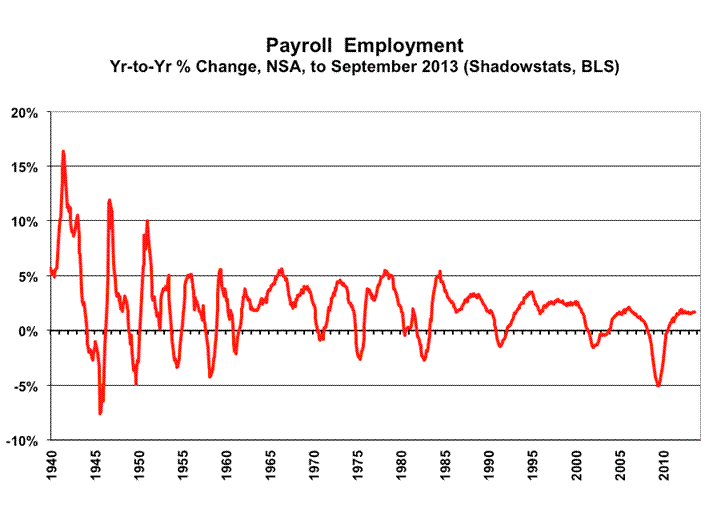 In terms of year-to-year change, the not-seasonally-adjusted annual change is untouched by the concurrent seasonal adjustments, so the monthly comparisons of year-to-year change at least are reported on a consistent basis. For September 2013, the year-to-year percent gain in payrolls slowed to 1.66%, from a revised 1.67% (previously 1.65%) in August, and versus an unrevised 1.66% (initially 1.72%) in July. These levels are consistent with pre-recession periods seen under normal economic circumstances.
