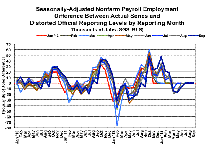 When the seasonally-adjusted September 2013 unemployment data were calculated, consistent, new seasonal factors also were recalculated for August 2013 and prior months. Based on the new seasonal factors, there is a revised August unemployment rate that is consistent with September’s new headline reporting, but it is not available to the public. Although the BLS knows that number, it will not publish it; it has left intact the now-inconsistent and obsolete number that previously had been reported for August. This issue is discussed further in the Concurrent Seasonal Factor Distortions section.