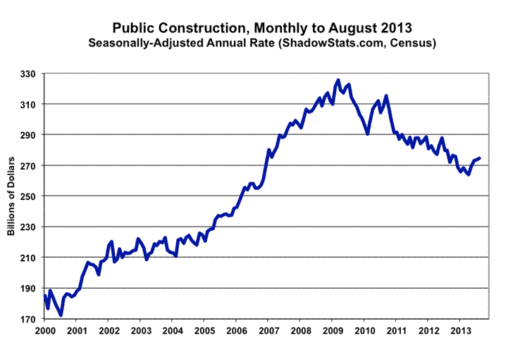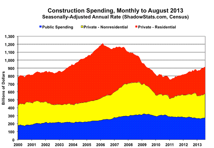 The statistically-insignificant 0.6% gain in monthly August 2013 construction spending included a 0.4% monthly gain in public construction spending, versus a revised 0.1% month-to-month gain (previously a 0.3% contraction) in July. August private construction was up by 0.7%, following a revised 1.9% (previously 0.9%) gain in July.