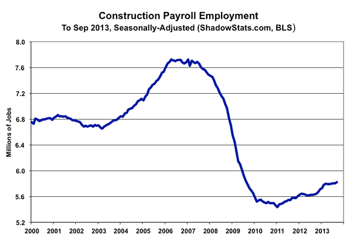 The next graph reflects the reporting of September 2013 construction employment, released this morning, with headline, seasonally-adjusted construction employment up by 20,000 in the month, at 5.826 million.