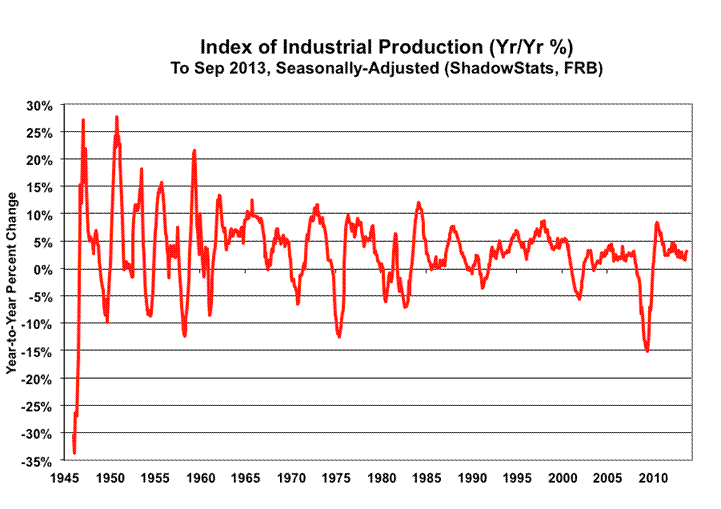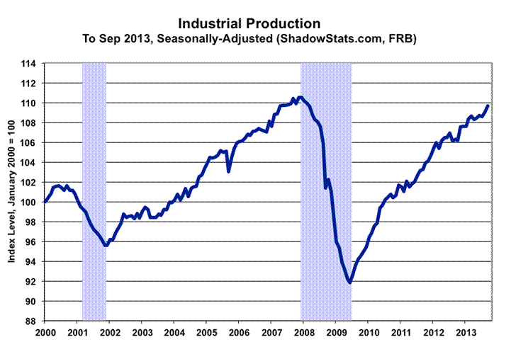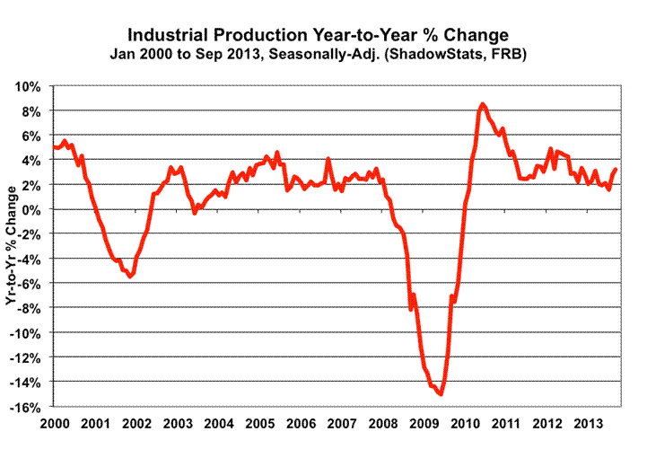 In the context of the utility-usage distortions, the headline 0.6% September gain remained well within the normal volatility of the series and, accordingly, was consistent with the ongoing stagnation or pending, renewed downturn in broad business activity that has been indicated for a number of months. Year-to-year production growth slowed to a revised 1.55% in July 2013, a level last seen in slowing annual activity in mid-2008, which was well into the early stages of the formal 2007 recession. Although annual growth in August rebounded to a revised 2.78%, and September rose to 3.19% (2.77% net of the unusual surge in utility usage), in normal economic times, this pattern of low-level year-to-year activity would be consistent with a pending recession or one that already was underway.