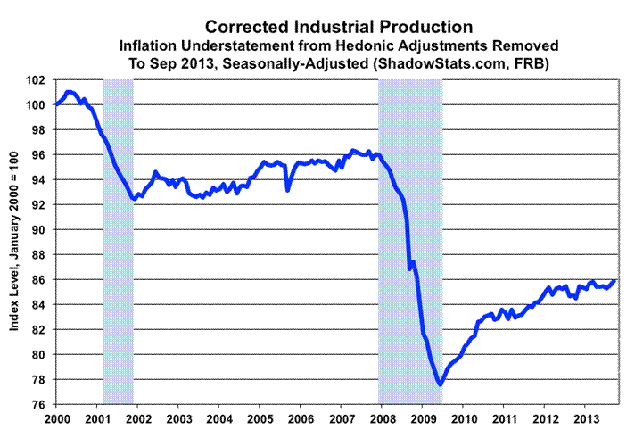 The “corrected” graph does show some growth in the period following the official June 2009 near-term trough in production activity. Yet, that upturn has been far shy of the full recovery and the renewed expansion reported in official GDP estimation. Corrected production levels have not regained pre-recession highs (even uncorrected September 2013 activity, though closing in, still is shy of the pre-recession peak by 0.8%) but, instead, entered a period of protracted low-level stagnation in 2012, with quarterly contractions in third-quarter 2012, second-quarter 2013 and with continued stagnation in third-quarter 2013.