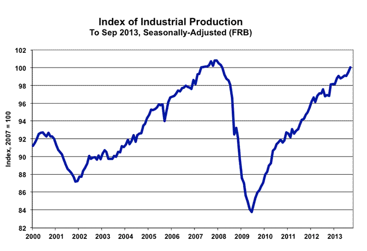 Industrial Production—September 2013. The Federal Reserve Board released its estimate of seasonally-adjusted, August 2013 industrial production this morning, October 28th. In the context of minor upside revisions to the prior six months of production activity (the period open to revision), headline monthly September production activity was up by 0.6% (0.57% at the second decimal point), up by 0.69% before prior-period revisions. The September gain was against an unrevised 0.40% gain in August, and a revised 0.07% monthly decline in July (previously a decline of 0.03%, initially a 0.04% monthly gain).