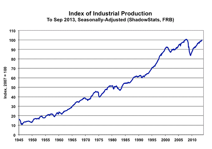 Industrial Production—September 2013. In the context of the utility-usage distortions, the headline 0.6% September production gain remained well within normal volatility of the series and, accordingly, was consistent with the ongoing stagnation or pending, renewed downturn in broad business activity, that has been indicated in recent months. Allowing for the unusual utility usage and the year-ago dampening impact of Hurricane Isaac on oil and gas production, annual growth in production has slowed to levels—not otherwise seen in slowing activity—since the early months of the formal 2007 recession.
