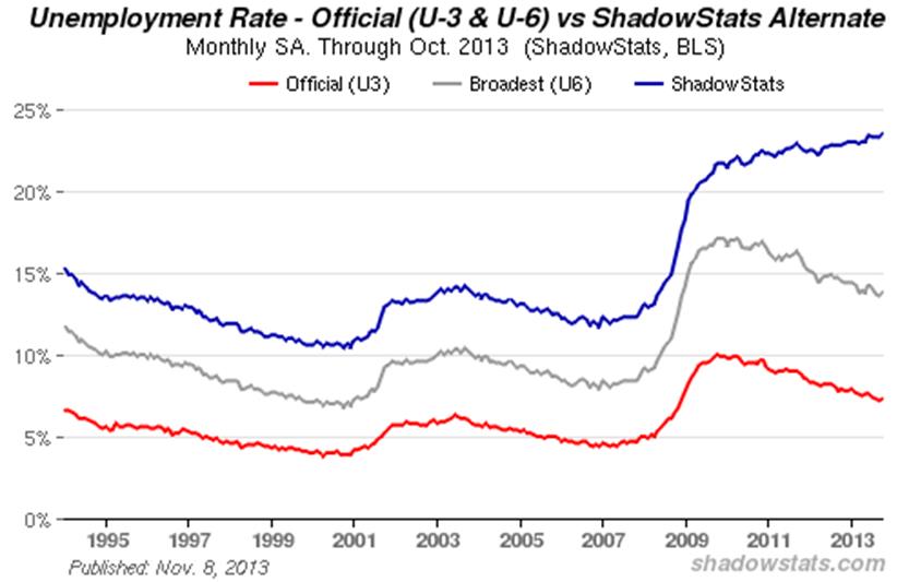 The following graph reflects headline October 2013 U.3 unemployment at 7.3%, up from 7.2% in September; U.6 unemployment at 13.8% in October, versus 13.6% in September, and the ShadowStats measure at a series high of 23.5% in October, up from 23.3% in September.