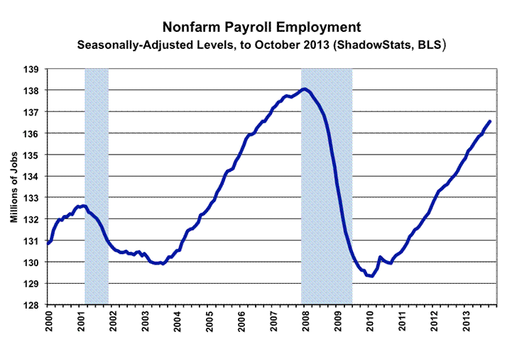 Using the latest concurrent-seasonal-factor calculations from the BLS, ShadowStats is able to estimate that the consistent, actual revised (but not published) month-to-month gain for August versus July was 206,000, instead of the official 238,000. In like manner, a shift of jobs-bloating seasonal factors were moved into the August to October 2013 reporting period, inflating both monthly payroll levels and month-to-month reporting.