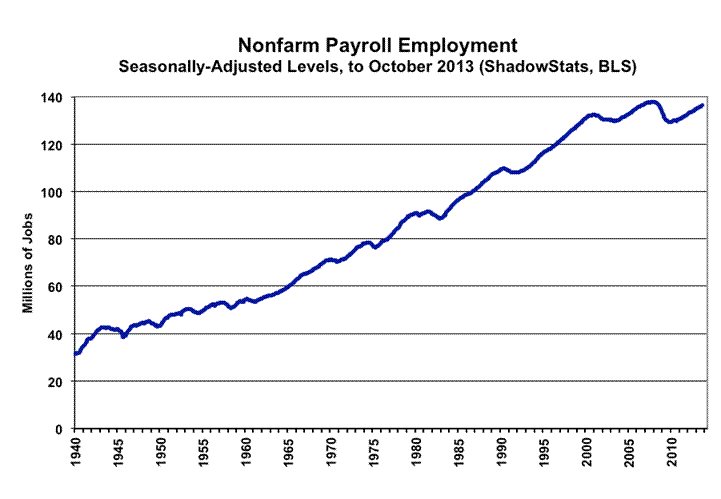 The following two graphs are updated for the headline payroll levels through October 2013. The year-to-year rates of change are graphed in the Reporting Detail section. Even with the annual growth seen in the payroll series since mid-2010, the October 2013 level of employment is shy by 1.5-million jobs, or 1.1% in official reporting, from recovering its pre-recession high of January 2008. In perspective, the longer-term plot of employment levels shows the extreme duration of the non-recovery in employment, the worst such circumstance of the post-Great Depression era.