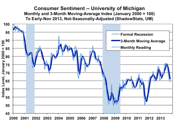 The University of Michigan’s early-November survey of consumer sentiment, showed continued month-to-month decline, as well as a declining three-month moving average. Consumer sentiment remains at levels that historically have been seen only deep in recession territory. There is no recovery here. On the debt-expansion front, consumer credit growth in the “recovery” has been primarily in student loans, not in the consumer lending that tends to fuel broad-based personal consumption.