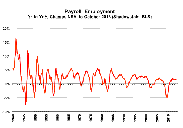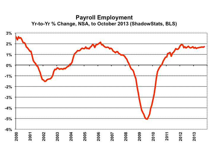 Not-seasonally-adjusted, year-to-year change is untouched by the concurrent seasonal adjustments, so the monthly comparisons of year-to-year change are reported on a consistent basis. For October 2013, the year-to-year percent gain in payrolls increased to 1.70%, from an unrevised 1.66% in September, and a revised 1.68% (previously 1.67%, initially 1.65%) in August. These levels remain consistent with pre-recession periods seen under normal economic circumstances.