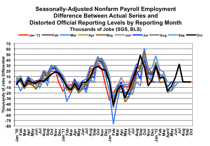 The use of concurrent seasonal factors (see the section by the same name in the Reporting Detail), and the practice of reporting headline payroll-employment change and revisions for just two months, allowed for a massive shift in seasonal factors to boost the latest jobs reporting. As will be discussed, for example, the headline monthly jobs gain in August 2013 was revised (inflated) to 238,000 from prior reporting of 193,000, but August and July detail—as of October—no longer were reported officially on a comparable basis. The comparable August gain versus July was 206,000. Based on the BLS’s consistent but unpublished reporting, which is estimated privately by ShadowStats—using BLS detail and models—the August gain actually was 32,000 less than the official reporting, much closer to the prior growth estimate.