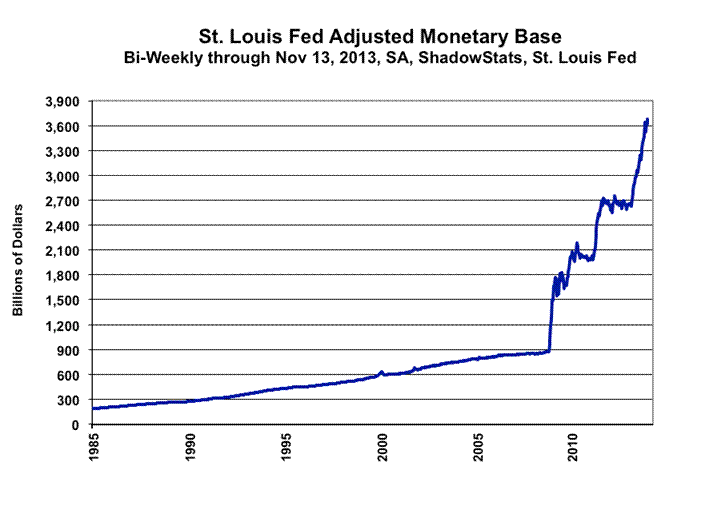 October M3 Money Annual Growth Rose to 4.4% from 4.1% in September, With the Monetary Base Still Exploding. The ShadowStats-Ongoing-M3 Estimate for October 2013 annual growth was 4.4%, versus 4.1% in September. Although regaining the annual growth level of June, the October number still showed a pattern of roughly level year-to-year growth as, shown in the accompanying graph, despite the continued explosive growth in the monetary base