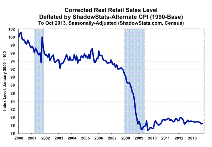 Corrected Retail Sales. The first graph following reflects real retail sales as usually reported by the St. Louis Fed, deflated by the CPI-U, but it is indexed to January 2000 = 100. ShadowStats did the deflation using the October 2013 CPI-U and nominal retail sales releases. The CPI-U, however, understates inflation (see the Public Comment on Inflation), with the effect of overstating inflation-adjusted growth. Instead of being deflated by the CPI-U, the “corrected” real retail numbers in the second graph use the ShadowStats-Alternate Inflation Measure (1990-Base) for deflation.