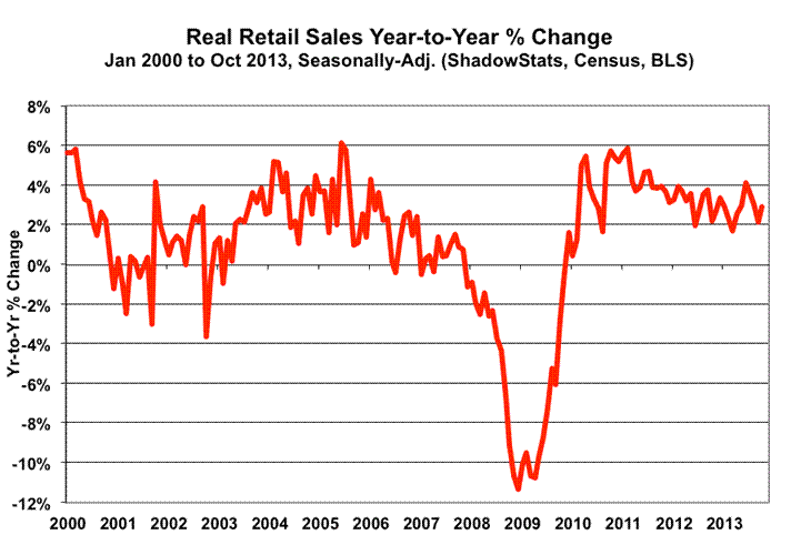 Retail Sales—October 2013. Constrained by intense, structural-liquidity woes, without real growth in income, and without the ability or willingness to take on meaningful new debt, the consumer simply cannot sustain real growth in retail sales. That said, October 2013 retail sales rose by a statistically-insignificant 0.41% for the month. Adjusted for a small decline in the headline CPI-U, that translated into a monthly gain of 0.47% for October real retail sales. Although those gains were above expectations, again, they were not meaningful, and they did not alter the basic outlook or traditional recession signals.
