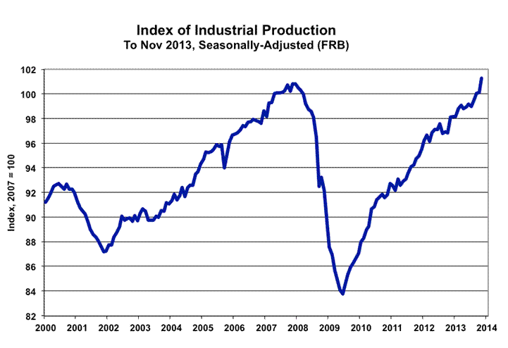 Industrial Production—November 2013. In the context of an upside revision to October and a downside revision to September (among minor revisions to the other four months of production that were open to revision), headline monthly November industrial production rose for the month by 1.1% (up by 1.13% at the second decimal point) and was up by 1.31% for the month, net of prior-period revisions. October revised to a gain of 0.1% (a 0.10% gain at the second decimal point, previously a 0.14% contraction). September production revised to a gain of 0.5% (0.52%, previously 0.65%, initially a 0.57% gain).