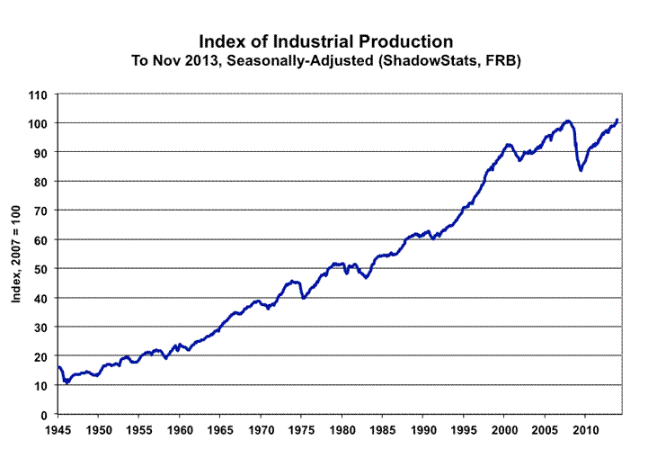 In this week of frequent economic releases and Commentaries, today’s missive will be brief, covering the detail from the November 2013 surveys of produce prices and industrial production. A more-comprehensive economic summary and review will follow in Friday’s (December 20th) Commentary No. 585, which will cover the third estimate, second revision of third-quarter 2013 GDP, subsequent to intervening reporting on November consumer prices and related real retail sales and earnings, and three-months of catch-up reporting on housing starts.