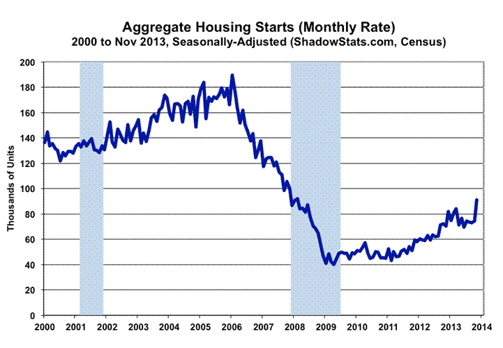 Graphs of Aggregate Housing Starts Activity. The record monthly low level of activity seen for the present, aggregate series was in April 2009, which was down 79% from the January 2006 peak. Versus the downside-spiked low in April 2009, the November 2013 headline number was up by 128%, but it still was 52% below the January 2006 series high.