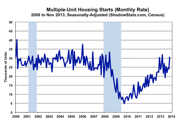 Aside from the November 2013 surge, activity in single-unit starts generally had remained stagnant in the post-housing-crash environment, and, after a slight uptrend, had moved lower. Multiple-unit starts activity has remained highly unstable and irregular. Though trending higher into first-quarter 2013, activity in this series also appeared to have shifted anew, to the downside, except for the November surge. With the private-housing market difficulties, former homeowners or those not entering the home-owning market have pushed up demand for rental units. In the context of extreme volatility, multiple-unit starts had moved irregularly higher to pre-crash levels earlier this year, although, again, they were trending lower, prior to the November aberration.