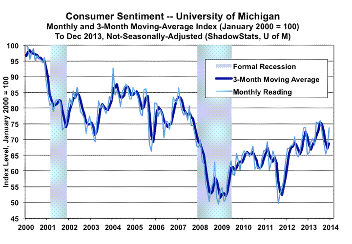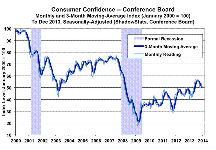 The last two graphs reflect the regularly-volatile consumer confidence (Conference Board) and consumer sentiment (University of Michigan) series through December 2013. Current levels in both series remain deep in traditional recession territory. The pattern here, as with household income, has been one of collapse and stagnation, as opposed to economic collapse and recovery indicated in the faulty GDP series.