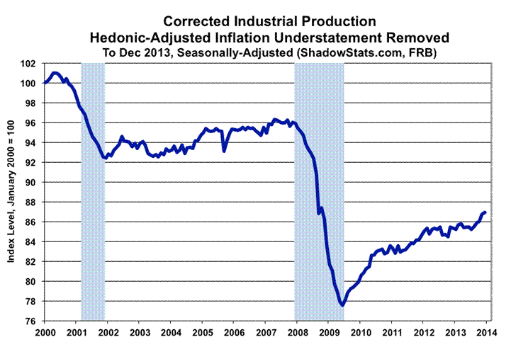 New High for the Production Series, But Still Inconsistent With the GDP. Headline December 2013 reporting, however, took the industrial production index to a new high, where the index level had broken above its pre-recession peak activity of February 2008, for the first time, last month. This “recovery” is not real, as discussed in the Corrected Industrial Production section that follows. The use of understated inflation in deflating certain components compiled in the production index has resulted in overstated headline production growth. As shown in the “corrected” graph, production remains well shy of an economic recovery.