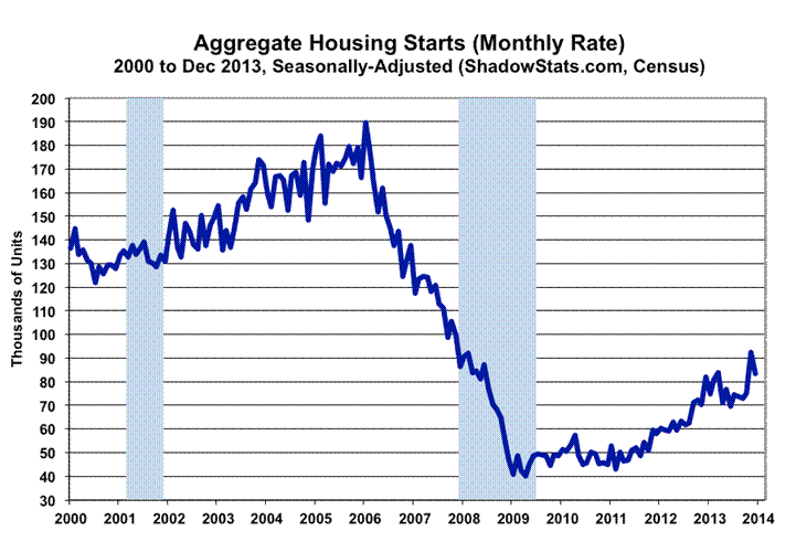 Graphs of Aggregate Housing Starts Activity. The record monthly low seen for the present aggregate series was in April 2009, which was down 79% from the January 2006 peak. Against the downside-spiked low in April 2009, the December 2013 headline number was up by 109%, but it still was down by 56% from the January 2006 series high.