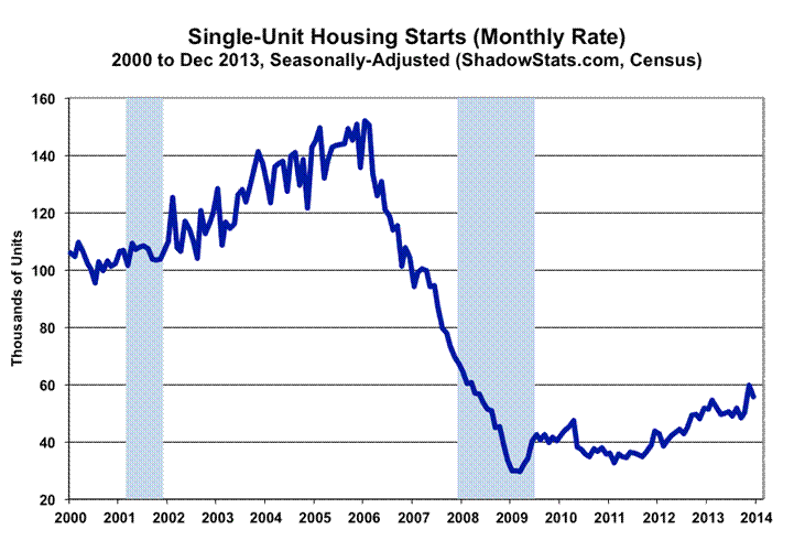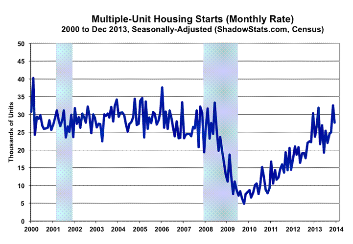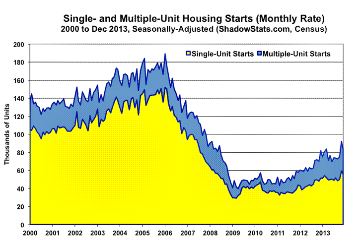 Housing Starts Fall Back, Correcting Minimally from Shutdown Distortions. December 2013 reporting of housing starts activity was not statistically significant, either in terms of month-to-month or year-to-year change. Nonetheless, aggregate housing starts, as well as single- and multiple-unit categories showed large pullbacks from the heavily distorted and still-unbelievable spikes in November activity, which likely resulted more from surveying, data gathering and reporting problems tied to the government shutdown, than from a sudden surge in housing activity (see Commentary No. 584).