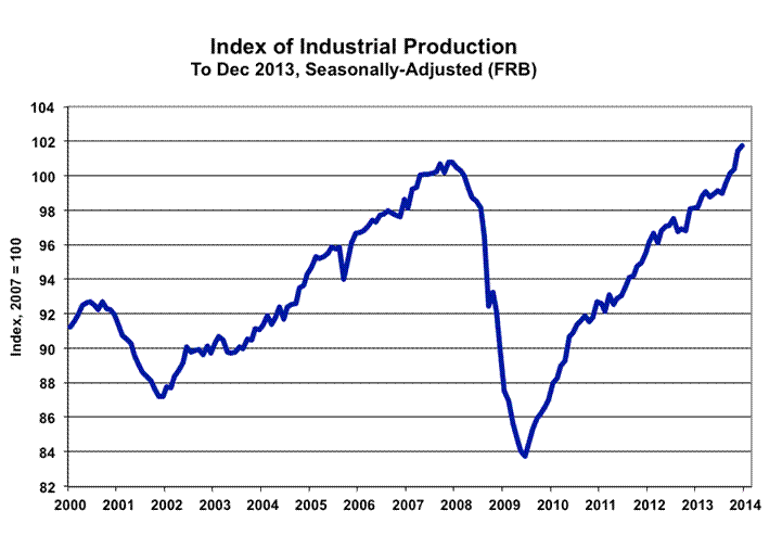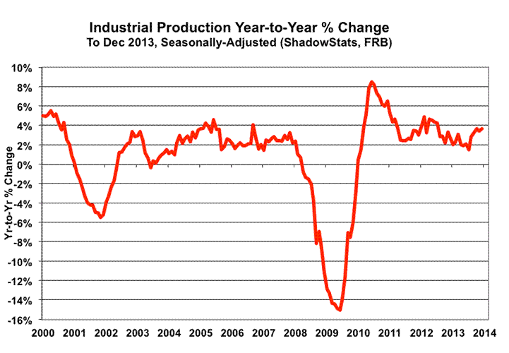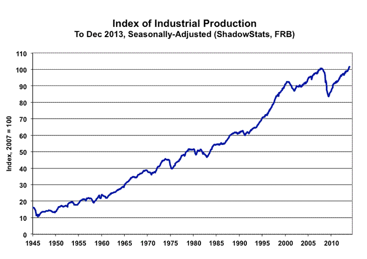 New High for the Series. Nonetheless, headline December 2013 reporting took the industrial production index to a new high, where the index level had broken above its pre-recession peak activity of February 2008, for the first time, last month. This “recovery” is not real, as discussed in the Opening Comments section. The use of understated inflation in deflating certain components of the production index has resulted in overstated headline production growth. As shown in the “corrected” graph in that section, production remains well shy of an economic recovery.