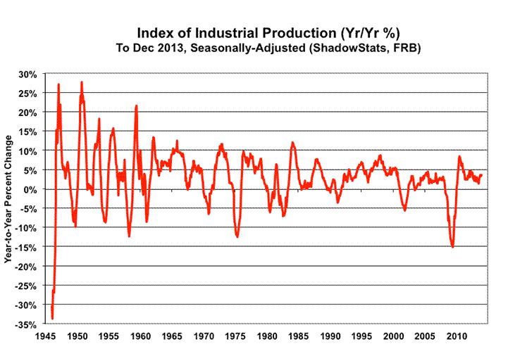 Year-to-year growth in December 2013 production increased to 3.68%, versus a revised 3.40% in November and a revised 3.68% in October. Allowing for series volatility and special factors tied to weather-related utility distortions, annual growth still has slowed to levels last seen during the mid-2008 economic collapse and remains consistent with annual growth patterns usually seen going into recession.