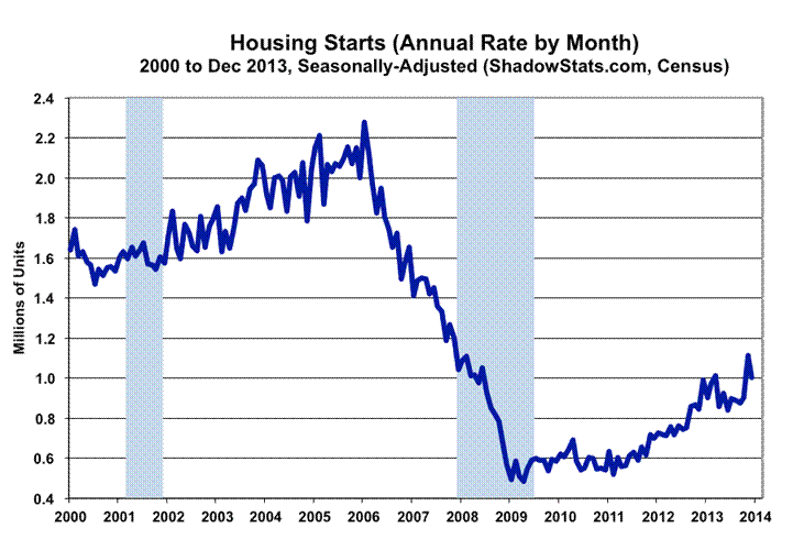 Year-to-year growth in the seasonally-adjusted, December 2013 total measure of housing-starts was a statistically-insignificant increase of 1.6% +/- 13.9%, versus a revised annual gain in November of 31.5% (previously 29.6%), and a revised October annual gain of 4.1% (previously 2.9%).