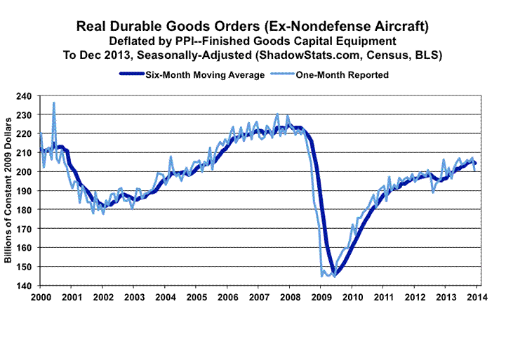 If the deflation measure here were corrected meaningfully for the hedonic-adjusted understatement of the respective PPI inflation measure, the post-2009 uptrend in real orders likely would be little more than a flat line, reflecting ongoing bottom-bouncing along a low-level plateau of economic activity, with a pattern of renewed downturn now well entrenched. Please note that the inflation series here will be revised after the publication of the revamped producer price index series, on February 19, 2014 (see Commentary No. 591).