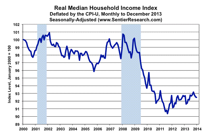 Along with consumer confidence, seen in the second graph, household income has shown a broad pattern of plunge-and-stagnation in the current economic crisis, as opposed to the GDP’s purported pattern of plunge, recovery and expansion. Those issues will be reviewed in Commentary No. 596 of January 30th, following the release of the “advance” estimate of fourth-quarter 2013 GDP (see the Week Ahead section).