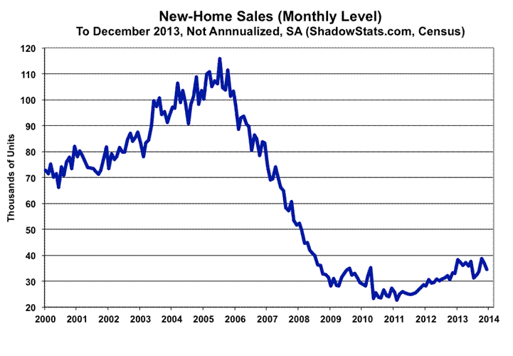 Some Correction to, and Back Off from, Recent Unstable Reporting. With December 2013 new-home sales falling by 7.0%, in the context of downside revisions to earlier data, reporting of housing- industry data appears to have entered a corrective phase. The headline December sales level reflected a statistically-insignificant 4.5% gain from December 2012, and should turn negative year-to-year in January 2014. December 2013 activity still was down by 70.2% from pre-recession peak activity, seen in June 2005.