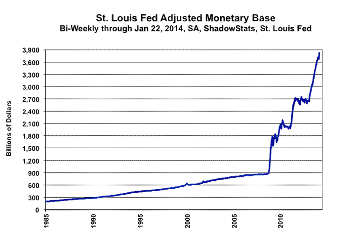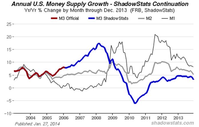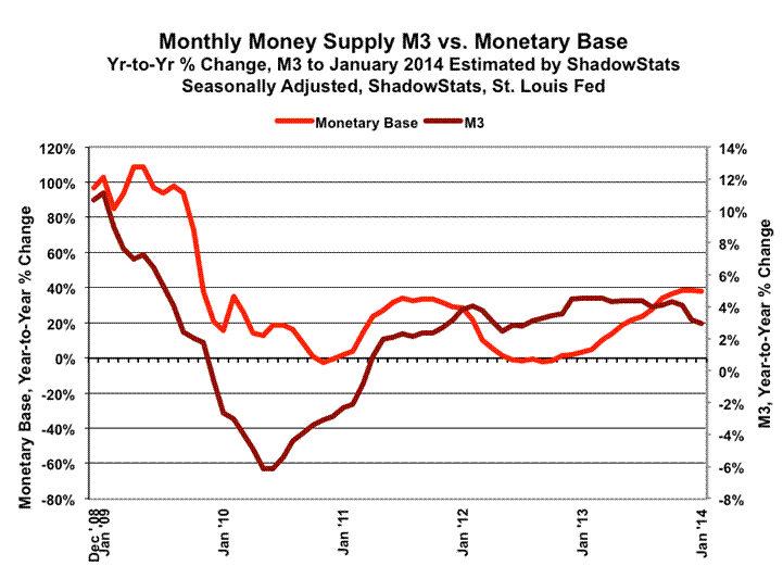 The slowing pattern of annual growth in M3 that had been in place, continues in place and appears to be ongoing, with a very early projection of year-to-year growth in M3 for January 2014 slowing to around 3.0% (see comments and graphs ahead on the monetary base) from the 3.2% currently estimated for M3 in December 2013. The last point in the following graph is for December 2013.