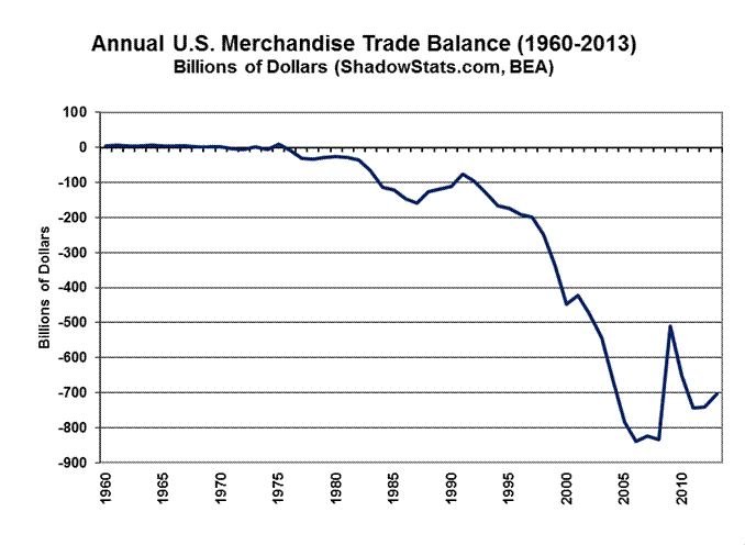 The services surplus increased from $206.8 billion in 2012 to $231.6 billion in 2013, but the data there are dominated by fantasy or imaginary plug numbers that are guessed at by the BEA. These numbers have been used for years, now, to help offset the merchandise trade shortfall. In contrast to the services sector, the merchandise data are hard, backed up by a paper trail. Regardless of short-term monthly volatility and gyrating oil prices, underlying economic reality continues to suggest an ongoing long-range deterioration in the U.S. trade deficit.