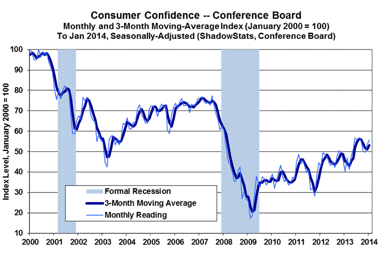The last two graphs reflect the volatile consumer confidence (Conference Board) and consumer sentiment (University of Michigan) series for full-January 2014 reporting. Current levels in both series remain deep in traditional recession territory. The pattern here, as with household income, has been one of collapse and stagnation, as opposed to economic collapse and recovery indicated in the faulty GDP series.