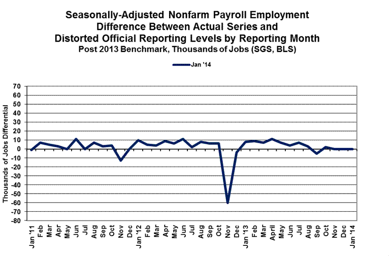 January 2014 Inconsistencies. While the 113,000 nonfarm payroll jobs gain reported for January was consistent with the revised 75,000 jobs increase in December, on a concurrent-seasonally-adjusted basis, those increases were not consistent with the revised headline 274,000 jobs gain reported for November or with any earlier published data. The new data show that the consistent jobs gain for November versus October was 272,000. The 2,000 jobs gain differential is unusually small, and likely will widen in future monthly revisions. Some historical month-to-month variations have come close to 100,000, plus or minus.
