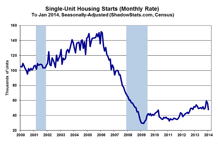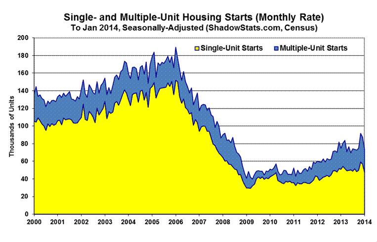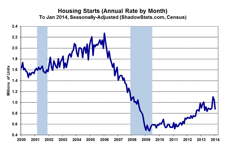 Year-to-year growth in the seasonally-adjusted, aggregate January 2014 housing-starts measure was a statistically-insignificant decline of 2.0%, versus an upwardly revised 6.6% annual gain for December, and minimally revised annual gain of 30.8% in November.