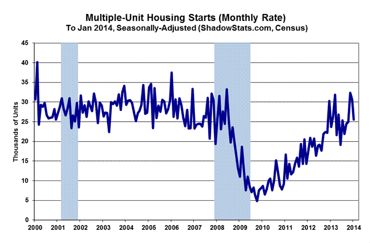 January 2014 Housing Starts—Catch-Up Monthly Plunge amidst Unstable Reporting. The housing starts series generally has been unstable enough in recent years that headline month-to-month changes in activity rarely have been statistically significant. Exacerbating that circumstance, the housing data—particularly housing starts and new home sales out of the Census Bureau—appear to have been distorted heavily by the impact of the October government shutdown on data-gathering and reporting processes. That was seen particularly with an initial headline monthly surge of 23% in November 2013 housing starts activity. Since then, monthly data have been reported on the downside, with the headline (and statistically-significant) 16.0% monthly decline in January 2014 starts returning the series to near-normal levels, both in the aggregate and by-unit categories. An upcoming annual revision to the housing data likely will result in the reporting of a smoother historical series. Going forward, monthly reporting should remain volatile, albeit at lower levels. The latest detail is reflected in the accompanying graph.