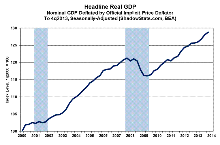 ShadowStats-Alternate GDP. The ShadowStats-Alternate GDP estimate for fourth-quarter 2013 is a 1.4% year-to-year contraction, versus a downwardly-revised headline year-to-year gain of 2.5%. The alternate third-quarter estimate was a 1.7% year-to-year contraction, versus a headline gain of 2.0% (see the Alternate Data tab).