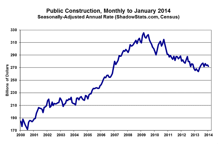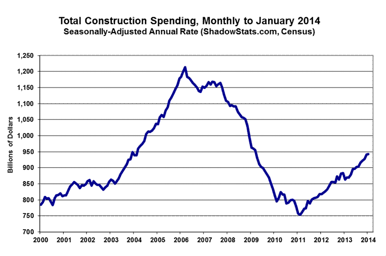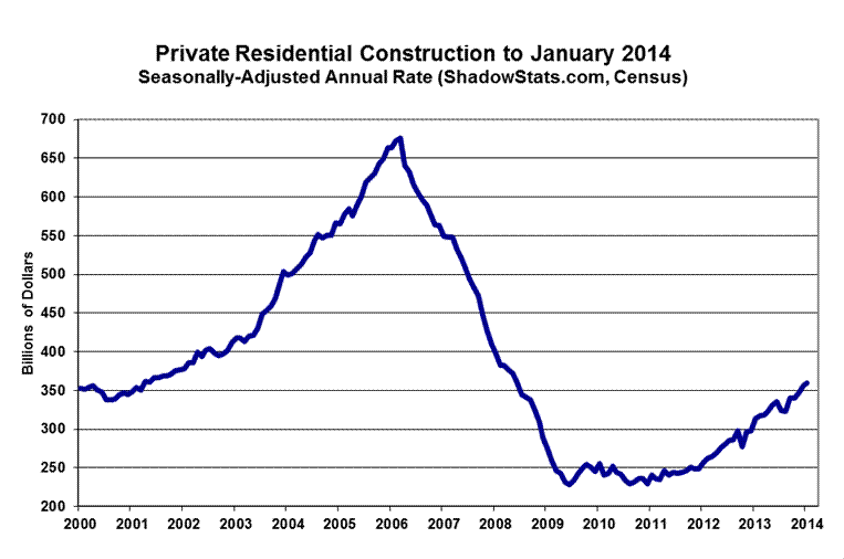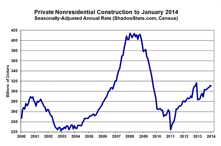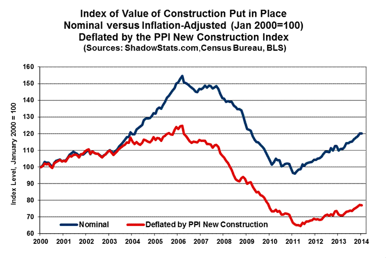 Adjusting Construction Spending for Inflation. There is no perfect inflation measure for deflating construction, but the pre-revision PPI’s “new construction index” (NCI) was the closest found in publicly-available series. ShadowStats continues to look for a more-appropriate index for construction that also is available to the public. The revamped PPI includes a new series called “final demand construction” (FDC). In contrast to the 1.3% year-to-year January 2014 inflation of the NCI, which the BLS has left intact and continues to publish, the FDC showed annual January 2014 construction inflation of 3.1%, more in line with private surveys of current construction costs. The big issue with the FDC, however, is that the BLS only publishes it with a history back to November 2009, which makes the reported detail of very limited value in deflating series that have histories going back decades. Accordingly, ShadowStats continues to use the NCI for deflation of construction spending, for the time being.