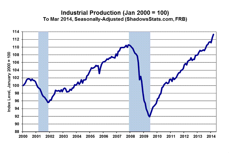 Production Series at Historic High, Still Inconsistent With the GDP. The headline production series had moved above its pre-recession high, for the first time, in November 2013. With the headline March 2014 production index level at 103.24 (Index = 100 in 2007), it remains marginally higher than the December 2007 pre-recession peak of 100.76.