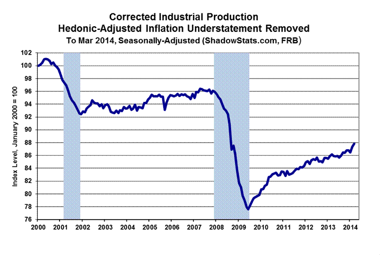 Corrected Industrial Production. Hedonic quality adjustments to inflation, understate the inflation used in calculating some components of industrial production. That has the effect of overstating the resulting inflation-adjusted growth in the headline industrial production series (see Public Comment on Inflation and the discussion in Chapter 9 of 2014 Hyperinflation Report—Great Economic Tumble).
