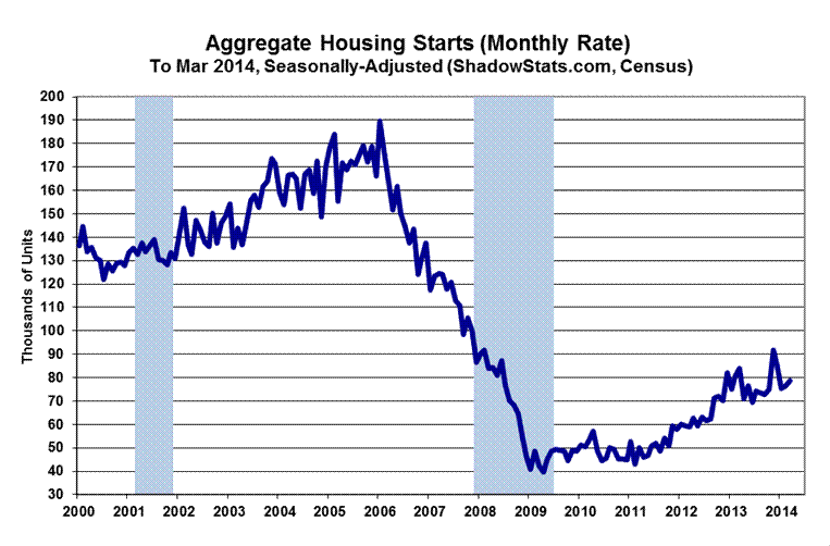 March 2014 Housing-Starts Reporting. The month-to-month headline gain of 2.8% in seasonally-adjusted March 2014 was statistically-insignificant. The monthly gain was in the context of an upside revision to headline February activity, but net of the prior-period revisions, the 4.3% gain in March housing starts still was statistically-insignificant.
