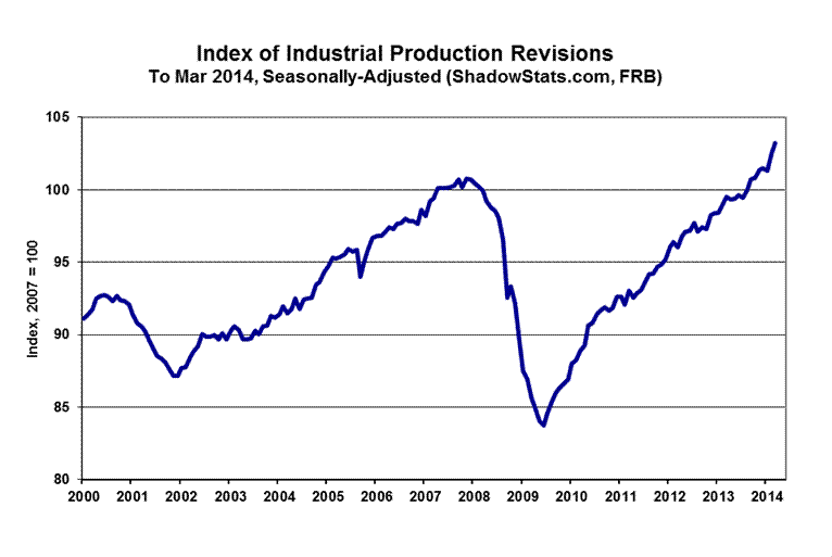 Industrial Production—March 2014. In the context of a large upside revision to reported February activity, headline monthly March production rose by 0.73% and was up by 1.24% for the month, net of prior-period revisions, where prior-period reporting was the benchmark revision. February showed a revised 1.17% (previously 0.62%) gain, versus a revised 0.21% (previously 0.15%) decline in January.